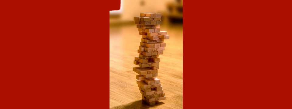 >Image credit: “Jenga tower standing on one tile,” by Guma89, Wikimedia Commons