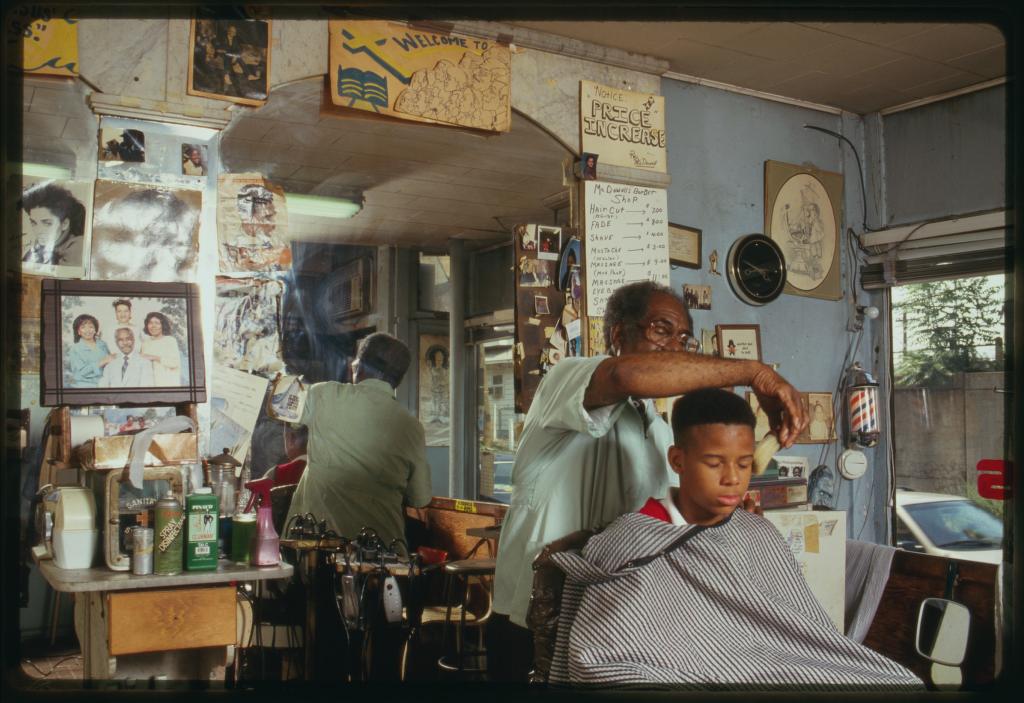 Image Credit: Martha Cooper, “Louis McDowell gives Michael Young a haircut” (1994), Working in Paterson Project, American Folklife Center, Library of Congress
