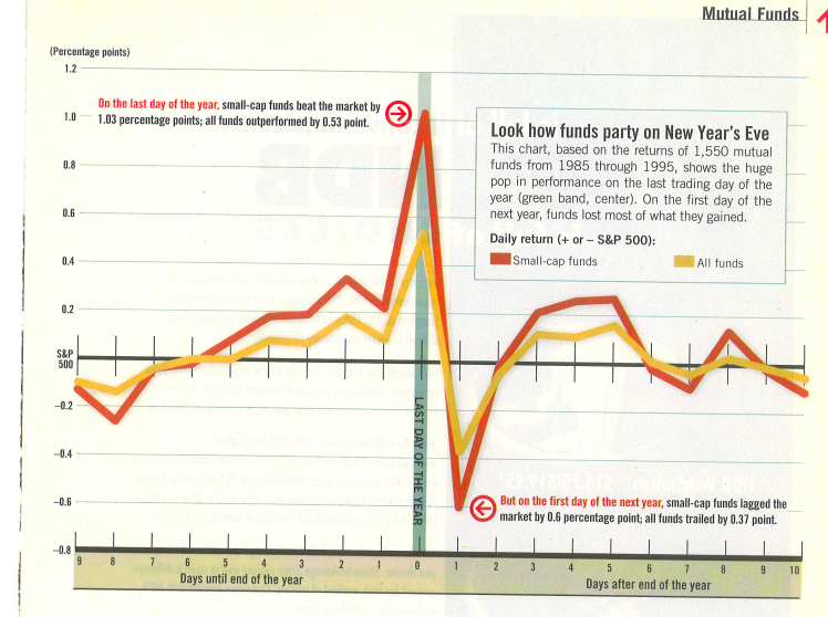 Small stocks party on New Year’s Eve. Carhart found that small stocks outpace the big companies in the S&P 500 by about one percentage point on the last day of the year. Since mutual funds tend to contain more small stocks than the market as a whole does, the funds benefit from this one-day blip in little stocks. Therefore, your fund manager’s “outperformance” may not only be coming just in a single day but also merely because he owns small stocks on the right day. That may not be skill at all; it might be luck.