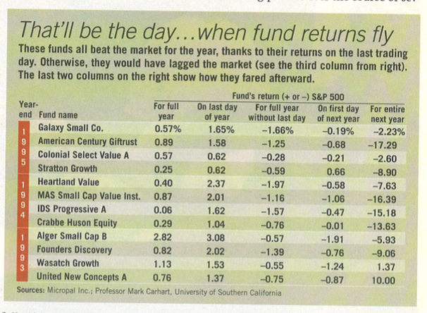 Indeed, I got in touch with nearly a dozen fund managers for this article, and each one said he hadn’t a clue why his fund fared so well on the last day of a given year. “It’s a mystery to me,” says Alger. “There are a lot of people who play the window-dressing game,” says Richard Huson of Crabbe Huson Equity Fund, “but we don’t.” Robert Puff, chief investment officer of the American Century funds, “has no idea” why some of the firm’s funds do so well on the last day of the year, says a company spokesman. Several managers speculate that risk-loving hedge funds might be bidding up small stocks also owned in mutual fund portfolios, lifting their values as well.
